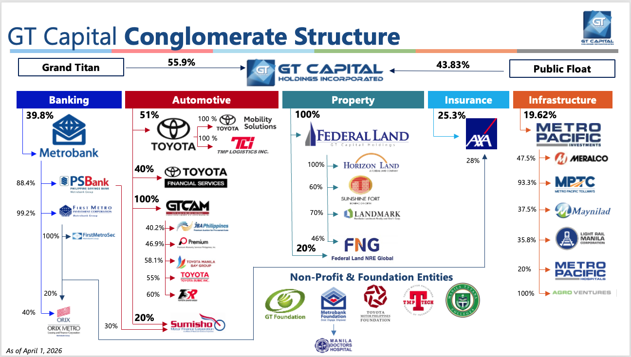 The following details GT Capital's complete conglomerate map and shareholding structure as of April 1, 2026: